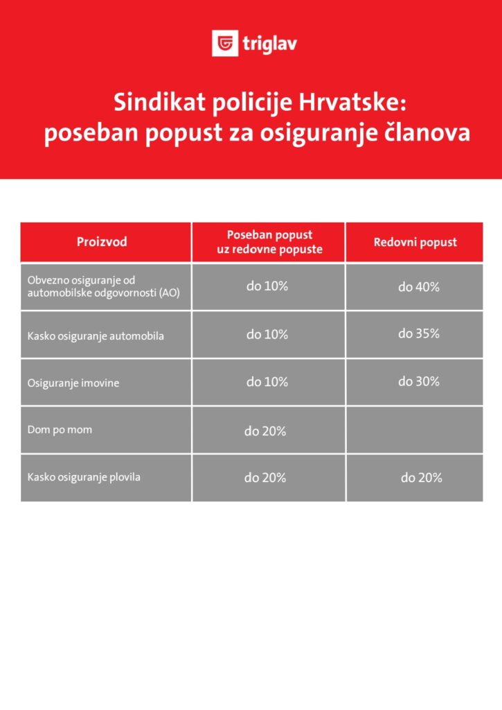 Sindikat policije Hrvatske sklopio je Ugovor o poslovnoj suradnji s Triglav osiguranjem s ciljem unapređenja pogodnosti koje se nude našim članovima. Ovim ugovorom svim članovima SPH, članovima njihove uže obitelji te članovima njihovog kućanstva omogućeno je sklapanje ugovora o osiguranju pod posebnim uvjetima koji uključuju značajne popuste i dodatne pogodnosti.